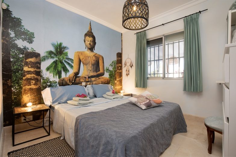 Tussen de 2 huizen door kom je in de achtertuin waar je direct een yurt ziet staan in een tuin voor de gasten. Hier bevinden zich heerlijke schaduwplekken onder de vele fruitbomen. De sfeer hier is meer bohemian.